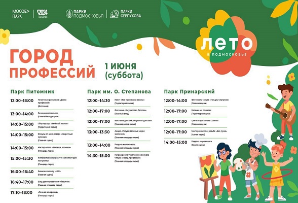 Для юных жителей Городского округа Серпухов подготовлено много площадок и разнообразных активностей. Одним из ключевых  мероприятий в этот день станет «Город профессий». Примерить на себя роль повара, парикмахера, строителя, эколога — всё это можно будет сделать в парке «Питомник».