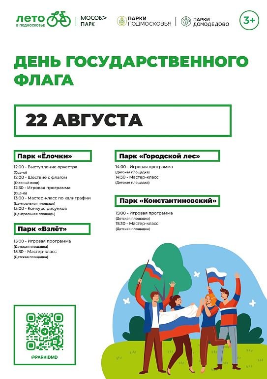 Праздничные мероприятия, посвящённые Дню государственного флага, пройдут сегодня в парках округа. Полная программа доступна в инфокарточке.