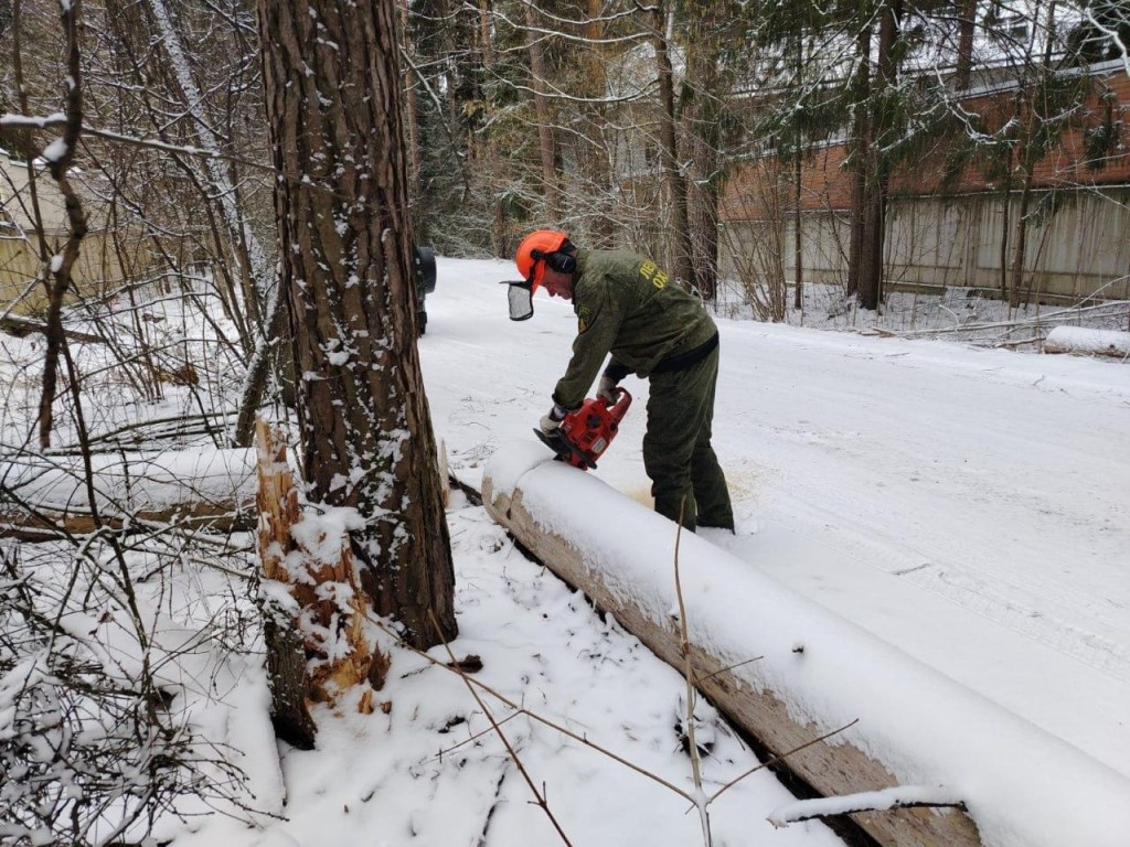 Лесничие убрали упавшее дерево с дороги вблизи деревни Дунино