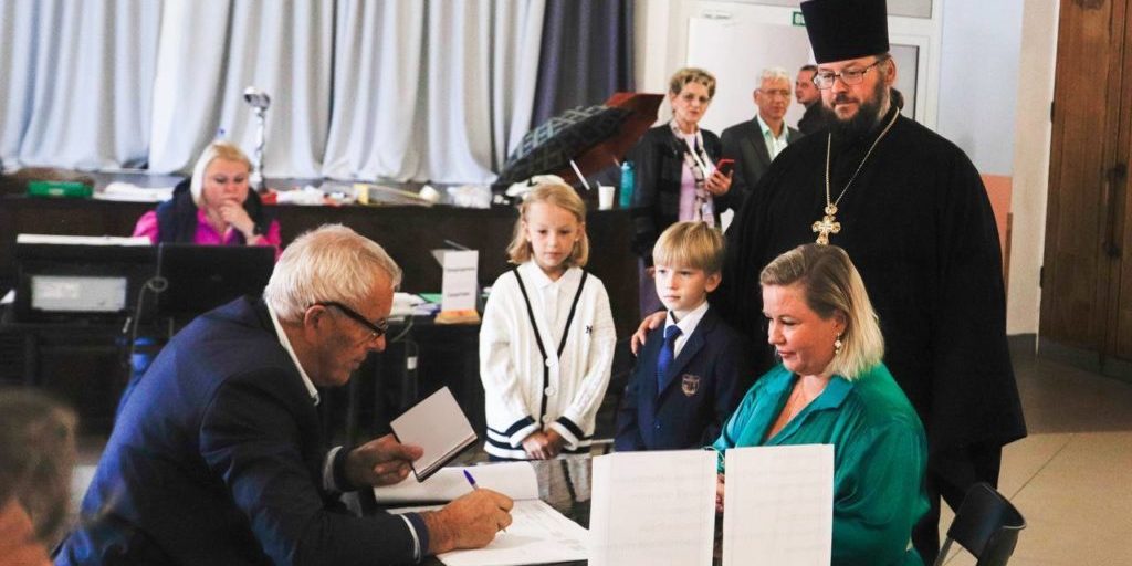 На избирательный участок № 790 отец Сергий и матушка Дарья Пятугины пришли с младшими детками. Все, как положено: зарегистрировались, получили бюллетени, поставили галочки и опустили бюллетени в КОИБы.