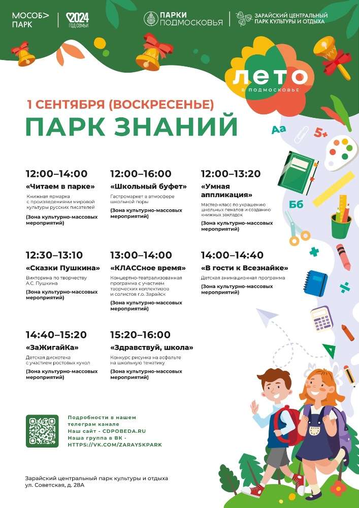 1 сентября в Зарайском центральном парке культуры и отдыха, в Центре досуга «Победа», состоится тематическое мероприятие под названием «Парк знаний».