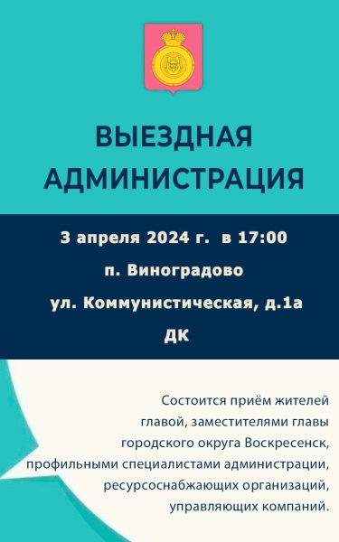 3 апреля в 17.00 в формате выездной администрации состоится приём жителей главой, заместителями главы городского округа Воскресенск, профильными специалистами администрации, ресурсоснабжающих организаций и управляющих компаний.