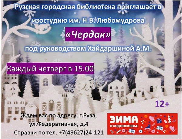 В Рузской городской библиотеке 16 января в 15 часов состоится занятие в изостудии имени Н.В. Любомудрова «Чердак» под руководством А.М. Хайдаршиной.