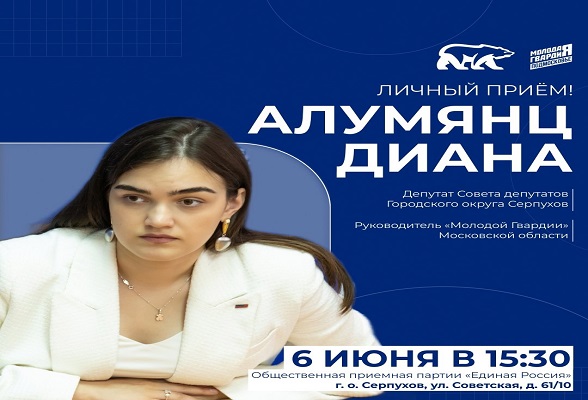 6 июня руководитель Московского областного регионального отделения общественной организации «Молодая Гвардия Единой России», депутат Совета депутатов городского округа Серпухов Диана Алумянц проведет личный прием жителей.