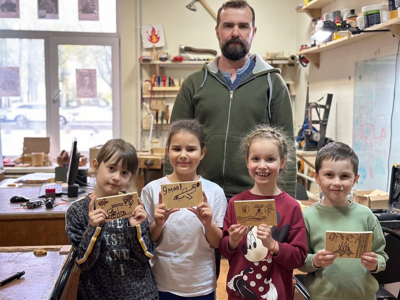 "Ребята нарисовали картинки на тематику 9 Мая. На дощечках у детей поехали танки, полетели самолёты, зажёгся Вечный огонь и стали развиваться Георгиевские ленты. Всё это ребята красиво оформили и выжгли. Поговорили с ребятами о предстоящем празднике и его важности, спели песню "Катюша"", - сообщил Александр Алексеевич.