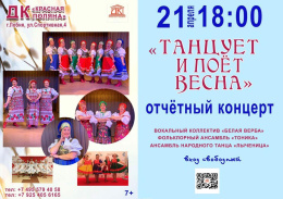 В Доме культуры «Красная поляна» городского округа Лобня состоится отчетный концерт коллективов ДК «Танцует и поет весна». Перед зрителями выступят: вокальная группа «Белая верба», фольклорный ансамбль «Тоника» и коллектив народного танца «Лыченица».